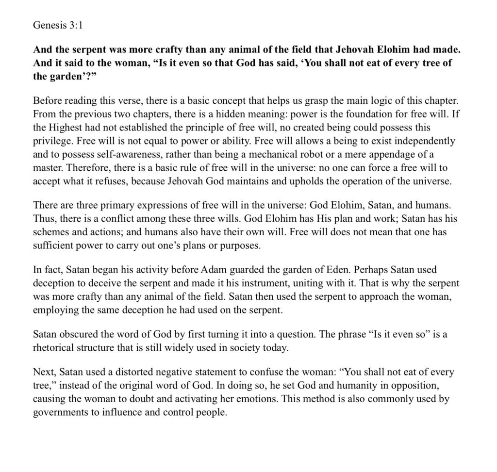 Next, Satan used a distorted negative statement to confuse the woman: “You shall not eat of every tree,” instead of the original word of God. In doing so, he set God and humanity in opposition, causing the woman to doubt and activating her emotions. This method is also commonly used by governments to influence and control people.