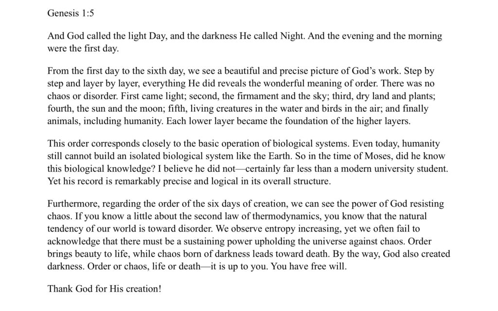 Furthermore, regarding the order of the six days of creation, we can see the power of God resisting chaos. If you know a little about the second law of thermodynamics, you know that the natural tendency of our world is toward disorder. We observe entropy increasing, yet we often fail to acknowledge that there must be a sustaining power upholding the universe against chaos. Order brings beauty to life, while chaos born of darkness leads toward death. By the way, God also created darkness. Order or chaos, life or death—it is up to you. You have free will.