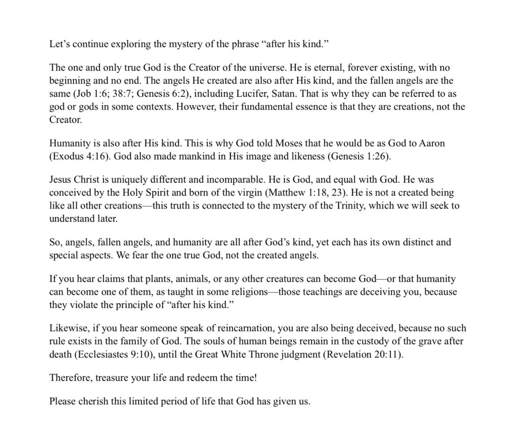 If you hear claims that plants, animals, or any other creatures can become God—or that humanity can become one of them, as taught in some religions—those teachings are deceiving you, because they violate the principle of “after his kind.”