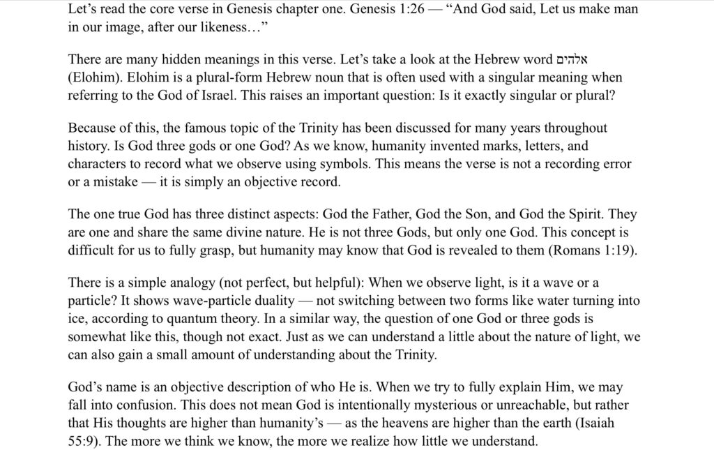 There is a simple analogy (not perfect, but helpful): When we observe light, is it a wave or a particle? It shows wave-particle duality — not switching between two forms like water turning into ice, according to quantum theory. In a similar way, the question of one God or three gods is somewhat like this, though not exact. Just as we can understand a little about the nature of light, we can also gain a small amount of understanding about the Trinity.